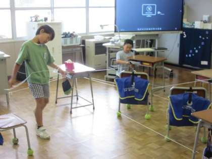 3年生は図画工作科で、毛糸をつなげて教室を変身させていました。机やいすも使って迷路のように毛糸をつないだり、レーダーに見立てた毛糸に触らないようくぐったりして楽しんでいました。