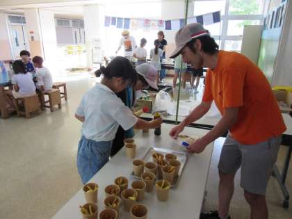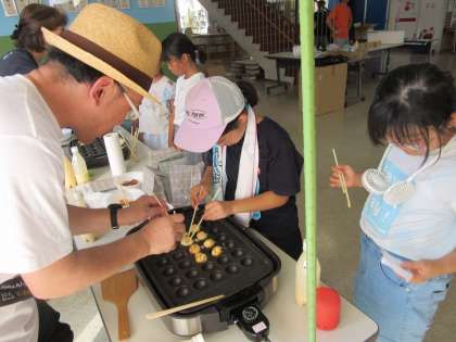 PTAの方々がつくって下さった焼きそばやポテトやたこ焼き、おいしいものばかりで子供たちからは笑顔があふれます。カステラ焼きは自分でつくる体験もでき、ひっくり返すのに苦労しながらも楽しそうでした。