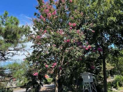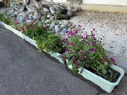 玄関前のサルスベリやプランターの花も、きれいな花を咲かせてみんなのことを待っています。