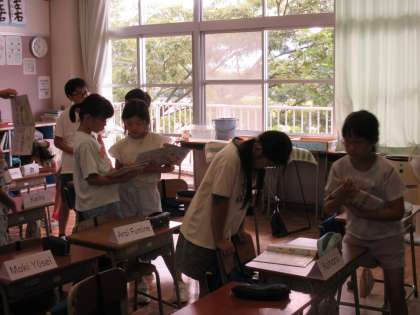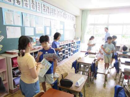 4年生は外国語活動の学習で、好きな時刻を友達と質問し合っていました。amやpmを使って時刻を伝えたり、「友達と遊べるから」「学校に行くから」等好きな理由を伝えたりしながら、友達と会話を楽しんでいました。