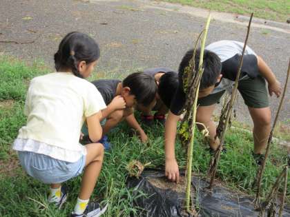 3年生は1学期に植えたヒマワリの種取りをしました。種がすっかり落ちてしまっていた花もあったので、地面も探していました。