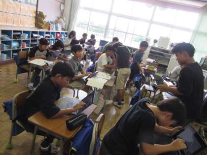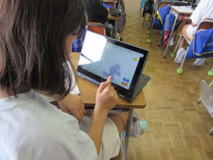 5年生は算数科で、四角形をすきまなくしきつめるチャレンジをしていました。四角形の内角の和が360度になることを利用して、上手に回転させながらしきつめていました。友達同士、しきつめることでできた形を見せ合いながら、活動していました。