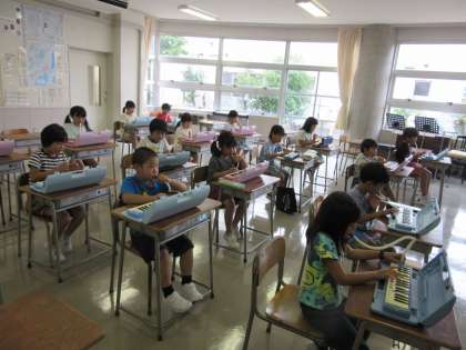 1年生は音楽科で鍵盤ハーモニカの練習をしていました。先生の伴奏に合わせて、「かえるのがっしょう」を演奏していました。曲に合わせて体を動かしながら、楽しそうに演奏していました。