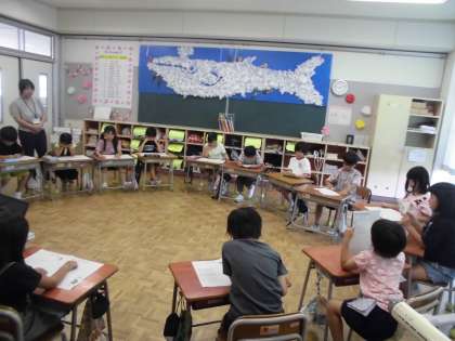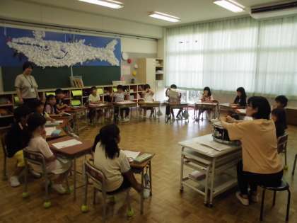 1年生の5時間目は、学習発表会の練習でした。今日は、BGMや先生が叩く太鼓のリズムに合わせて、せりふをつないでいました。役を決めたばかりの1年生ですが、自分のせりふのタイミングでしっかりと言えていました。どんどん上達する1年生です。