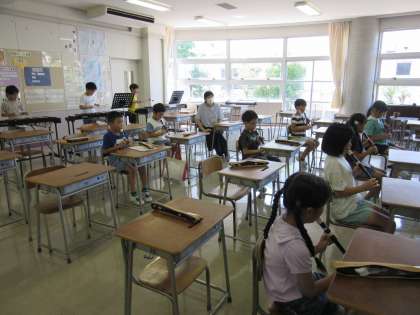 3年生は音楽科で、リコーダーと木琴を使って合奏をしていました。3年生になって始めたリコーダーですが、どの子もきれいな音が出せるようになってきました。姿勢も意識してきれいな音が出せるようにがんばっています。