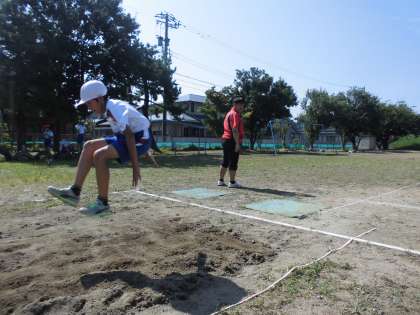 6年生の2時間は、体育の学習でした。来週のチャレンジ陸上記録会に向けて、今日はグラウンドの砂場で走り幅跳びの練習をしました。助走距離や歩数を確かめたり、本番と同じ流れで試技したりと頑張っていました。
