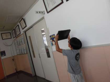 2年生の2時間目は、国語の学習でした。校舎内にある看板や標識等を見付けて、その工夫をまとめます。今日は、一人一人クロームブックを持って、校舎内にある看板や標識等を撮影していました。