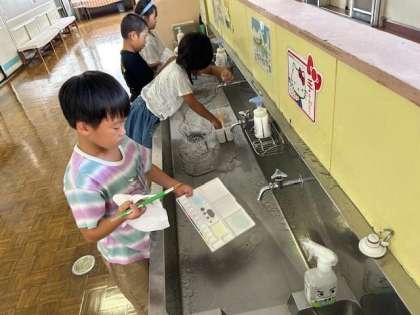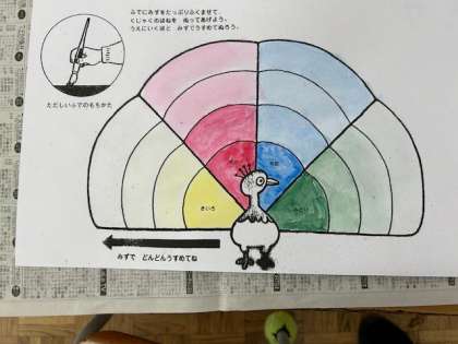 1年生は図画工作科で水彩で色を塗る練習をしていました。水の量を少しずつ変えて、色の濃淡の変化を楽しんでいました。