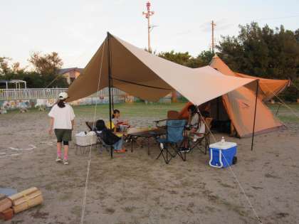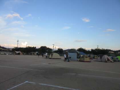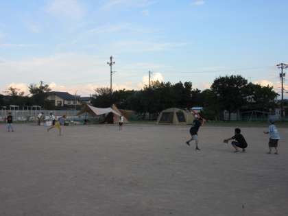 日も暮れて涼しくなってきました。グラウンドにはテントがたくさん並んでいます。子供たちは友達と楽しくそれぞれの時間を過ごしています。