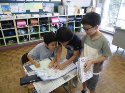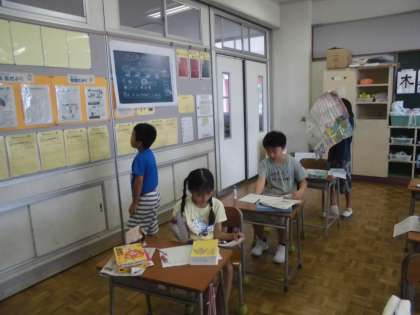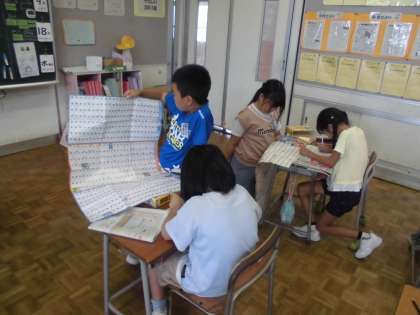 3年生の6時間目は、国語の学習でした。選んだカードに書かれた漢字の一部が使われている漢字を見付け、ワークシートに書いていきます。パソコン以外なら、何を使って調べてもよいという条件でしたが、子供たちは進んで漢字を見付けたり、自分のミッションが終わると友達を手伝ったりして、楽しく学習に取り組みました。