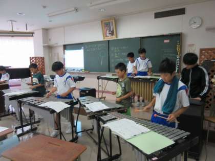 6年生は音楽科で合奏をしていました。様々な楽器を使い、複数のパートに分かれて演奏します。個別に練習をした後、少しずつ音を重ねていきます。