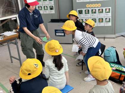 飼育員の方に、動物のお世話について教えていただきました。食事の量や、うんちの様子から健康状態を見ることや、よく観察することの大切さを教えていただきました。グループで感想を伝え合う場面では、「飼育員さんは大変だと思った」「オスとメスでうんちの形が違うので驚いた」等素直な感想を話していました。