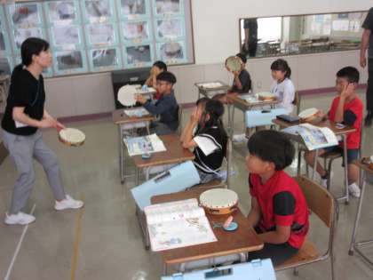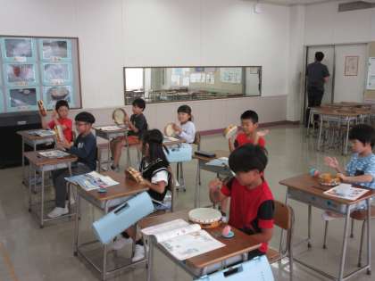2年生は音楽科で、タンブリンでの演奏に挑戦していました。タンブリンを振った時の音、たたいたときの音を聞き比べたり、実際にいろいろな演奏方法を試したりしながらタンブリン演奏を楽しんでいました。