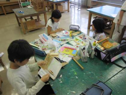 4年生はのこぎりやくぎを使った作品がいよいよ仕上がってきました。「こんな風に使うよ」「〜の形に仕上げたよ」自分の作品をうれしそうに紹介してくれます。