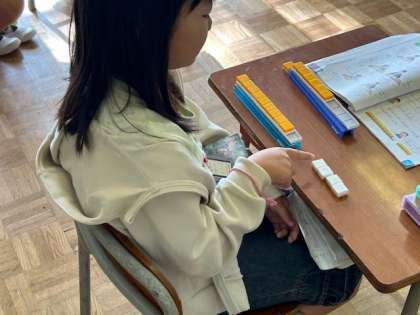 1年生は算数科で、繰り上がりのある足し算の学習をしていました。ブロックを動かしながら、どうやったら計算できるか考えていました。