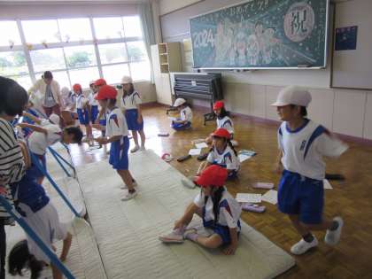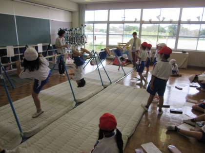 1年生は体育科で、ぶら下がり技、回転技等いろいろな技に挑戦しています。見ている子供たちも、応援したり、教えてあげたりと一生懸命です。
