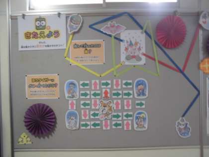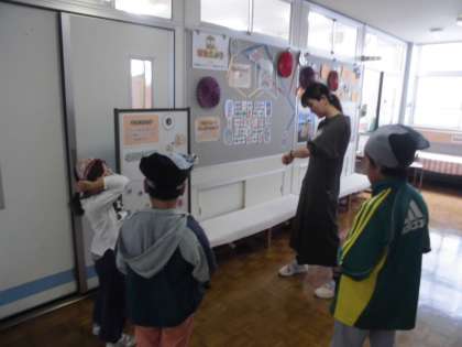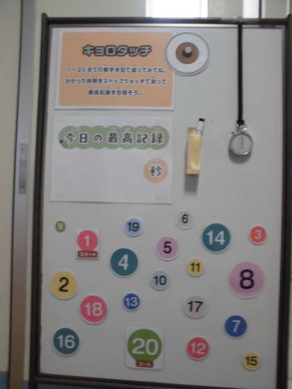 10月は、目の愛護月間です。保健室前には、目を鍛える掲示物があります。書かれている数字を目で追いかけるトレーニングには、休み時間になると、子供たちがたくさん集まっています。