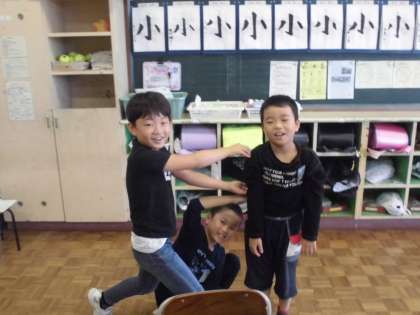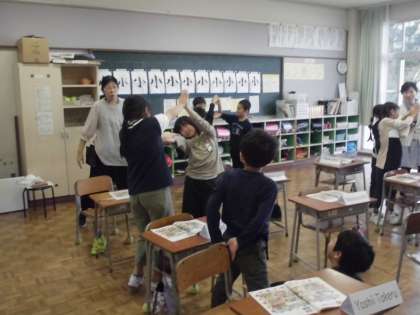 3年生の2時間目は、外国語活動でした。教室に行ってみると、体を使ってアルファベットの形を表現していました。友達と楽しく学習しています。