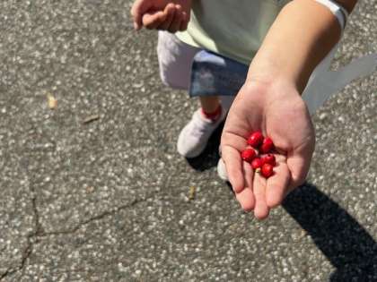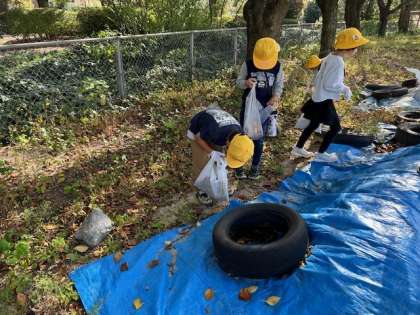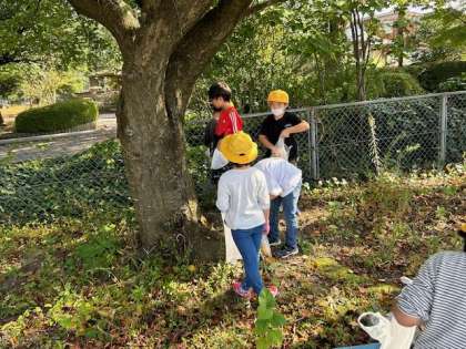 1年生は校庭で秋みつけをしていました。いろいろな色や形の葉っぱや、どんぐり、木の実を見付けて、友達や先生に見せ合いながらたくさんの秋を袋に入れていました。