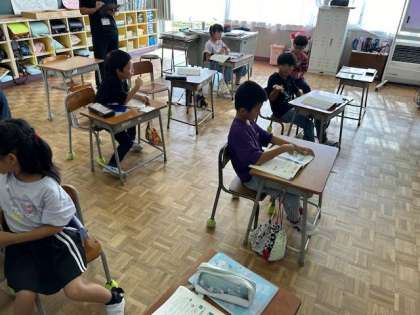 2年生は算数科で直角の学習をしていました。折り紙を使って直角をつくる活動では、一人で集中してつくったり、友達と教え合いながらつくったりしていました。