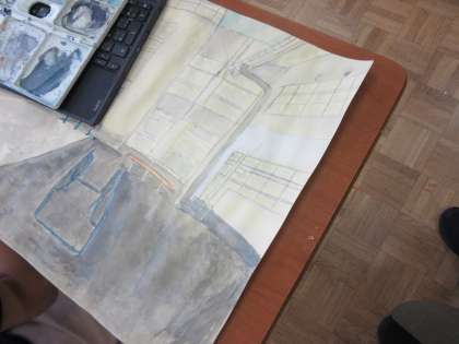6年生は図画工作科で、校舎の絵を描いていて、今日はどの子も水彩で色を塗る活動をしていました。遠くと近くで色を少し変えたり、同じ白や灰色でも場所によって少しずつ色を変えたりして、自分たちの学校の校舎の絵に取り組んでいます。