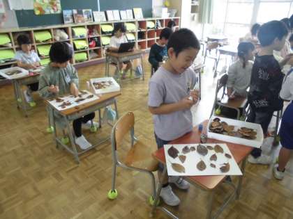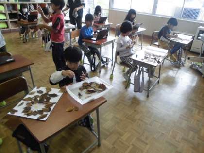 1年生の3時間目は、図工の学習でした。見付けた葉っぱを画用紙に貼っていました。イメージを大切にして、作品づくりに取り組んでいました。