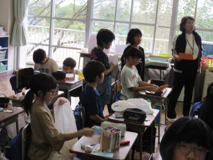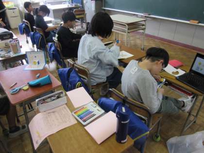 4年生は総合的な学習の時間で独居老人宅訪問を行います。訪問に向け、プレゼントのカードと手紙の準備をしていました。「ハロウィンの季節だからお化けのイラストにした」「お話のきっかけになると思って、昔のアニメのキャラクターをカードに書いた」等、相手のことを考えて準備を進めていました。