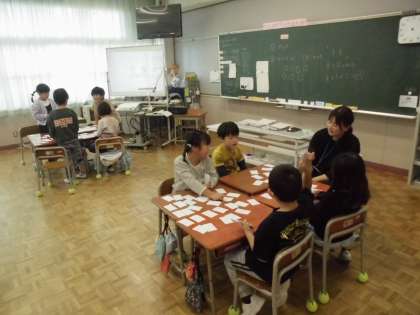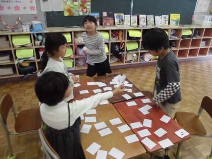 1年生の2時間目は、算数の学習でした。3つの数を足して「11」になるように、カードを3枚選ぶゲームをしていました。カード2枚まではすぐに選ぶことができますが、あと1枚選ぶとなると、慎重になる子供たち。とても楽しく一生懸命に取り組んでいました。