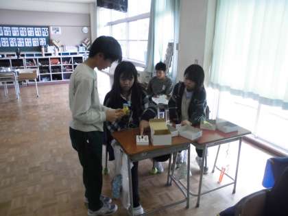 6年生の3時間目は、理科の学習でした。手回し発電機で貯めた電気を使って、豆電球や発光ダイオードを光らせたり、モーターを動かしたりしました。友達と協力し合って実験を進めていました。