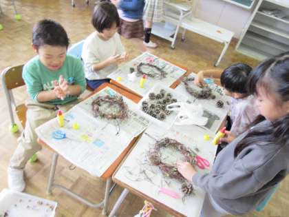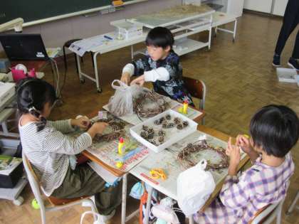 1年生はアサガオの蔓や、身の回りで見付けた秋のものを使ってリースづくりをしていました。松ぼっくりや、ドングリなどをたくさん飾り付け、世界で一つのすてきなリースができました。