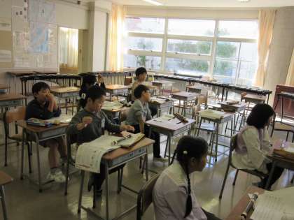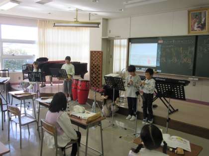 3年生は音楽科でリコーダー演奏に取り組んでいます。「メリーさんのひつじ」を3拍子のリズムで演奏します。聞き慣れた4拍子のリズムとの違いに苦労しながらも、がんばって演奏しています。聞いている子供たちも、手で3拍子のリズムをとるなど応援しながら聞いています。
