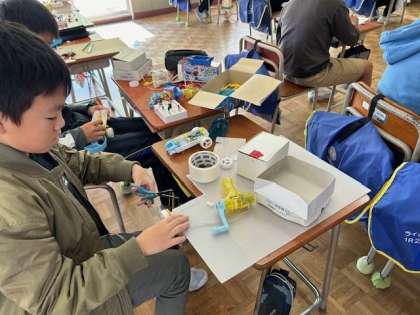 6年生は理科で電気のはたらきについて学習しています。これまで学習したことを生かして、電気を使った物を製作しています。船や自動車、扇風機等、一人一人材料をどう使おうか考えながら活動していました。実際に動く様子を見るのが楽しみです。