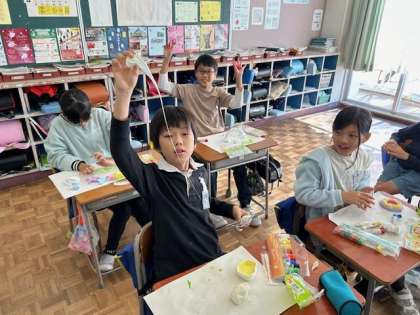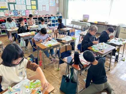 4年生は図画工作科で「元気のお守り」をつくりました。自分のお気に入りの物、元気が出そうな物をつくっている子供たちがすでに笑顔いっぱいでした。