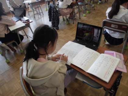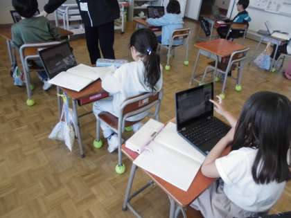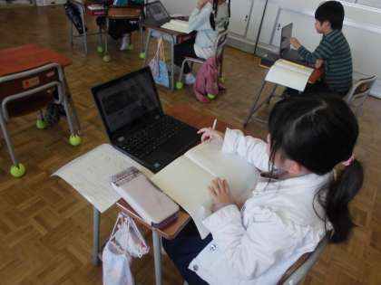 1年生の5時間目は、国語の学習でした。「じどう車くらべ」の説明文の学習の一つでじどう車ずかんをつくっています。自分が関心のある働く車の中からずかんにしたい車をいくつか選び、その仕事や車のつくりを調べ、ノートにメモしています。