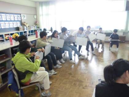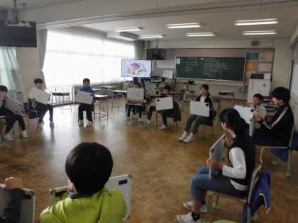 6年生の2時間目は、家庭科の学習でした。冬のくらしについて衣食住の視点で学習しています。「冬」と言えば・・・「正月の遊び」と言えば・・・等、多くの人が頭に思い浮かべるだろう物やことを考えて、ホワイトボードに書きました。クラスみんなでサークルになり、互いの表情も見ながらイメージしていました。