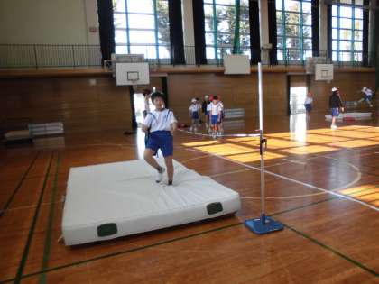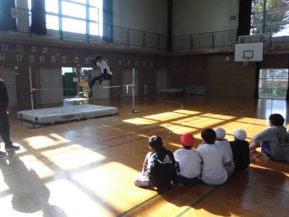 6年生の2時間目は、体育の学習でした。今日は、跳ぶ前の3歩のリズムを意識して練習していました。学びのアシストとして来られている大学生のお兄さんに、走り高跳びの手本を見せてもらい、子供たちは「すごい」「跳ぶとき、一気に高さが増す」等の感想をつぶいやいていました。