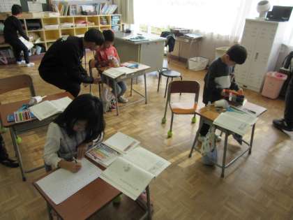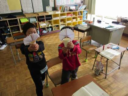 2年生は国語科の学習で、説明文を読んでおもちゃをつくっていました。「まず」「つぎに」等の言葉を意識して、文章を読みながらおもちゃづくりに取り組んでいました。完成したおもちゃで早速楽しそうに遊んでいます。