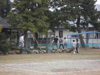 生き生きタイムの四方っ子です。図書ラウンジで本の貸し借り、グラウンドでタイヤじゃんけんやブランコ等、好きなことをして過ごしています。