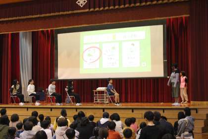 学習参観後に、学校保健委員会を行いました。今年度のテーマは「よい姿勢」。健康委員会の児童が中心となり、よい姿勢のメリットや基本姿勢を紹介してくれました。