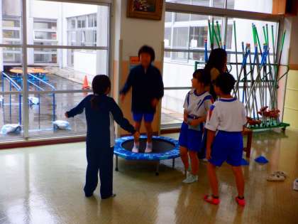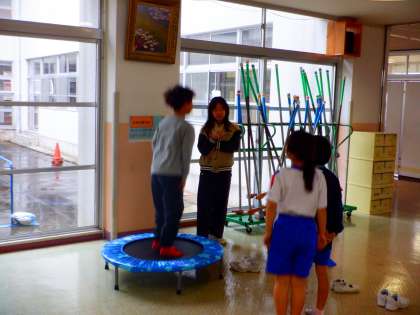 トランポリン跳び放題の様子です。トランポリンを跳んでいる人を見て、待っている人も横で跳んでいます。ジャンプするのも、体幹が鍛えられますね。