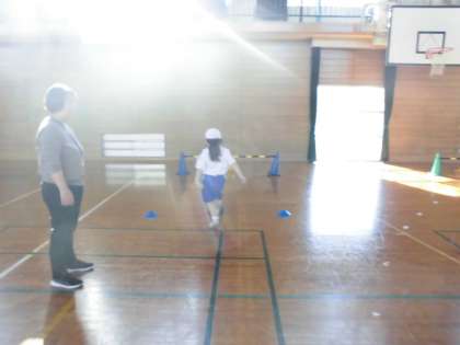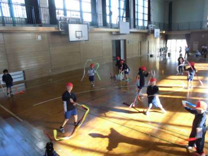 サッカーは狙ったところにボールを蹴ったり、リボンは絡まらないように上手く動かしたりしました。縦割り班のみんなと安全に仲よく運動することができました。