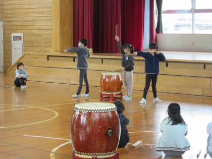 4年生は5年生から引き継いだ和太鼓練習に取り組んでいます。先週まで5年生にも教えてもらいながら取り組んでいましたが、今週からは4年生のみでの練習です。短い時間で複数のリズムを教えてもらい、真剣に取り組んでいる様子が見られました。