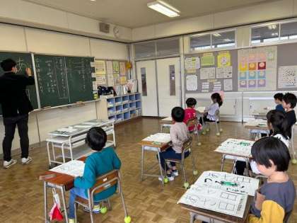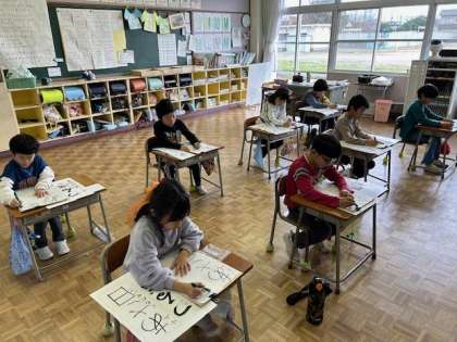 2年生は昨年に引き続き、2度目の硬筆墨での書き初めです。書き初めをする時の心構えについて話を聞いた後、早速書いてみました。「ここで書くと太くなるよ」「『日』は、同じ高さになるように書くって書写でやったよ」等、これまでの学習を生かして書こうとしていました。