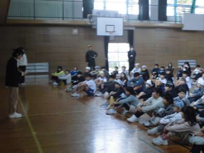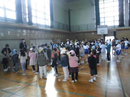 清掃時間に避難訓練を行いました。今日は、縦割り清掃でしたが、避難の放送を聞くと6年生のリーダーを先頭に落ち着いて体育館に避難しました。ハンカチを携帯していなかった子供は、三角巾で口や鼻をふさぐなど工夫していました。講評した先生が「こんなときどうする?」といくつか状況を示すと、子供たちは「自分だったら」とじっくりと考えました。