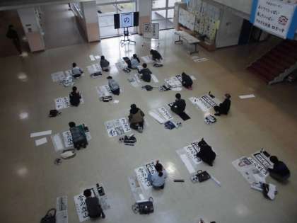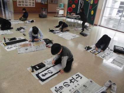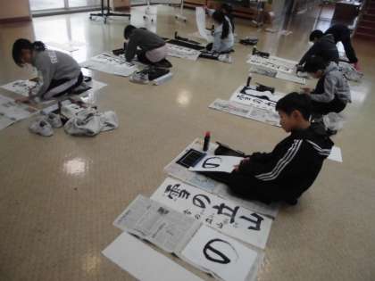 4年生の1時間目は、書き初め練習でした。多くの子供たちが、平仮名の「の」に苦戦していたので、今日は「の」を意識して練習しました。最後がかすれないようにゆっくりと筆を運んだり、力の加減を調節したりしながら、「雪の立山」を書いていました。
