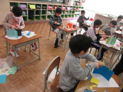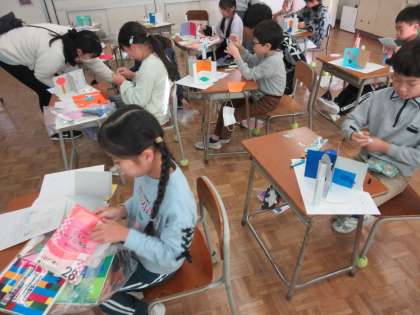 3年生は図画工作科で、わりピンで景色がくるくる変化する作品づくりをしています。「朝昼夜」「春夏秋冬」等、3つや4つの場面がそれぞれの自分の考えた景色になるよう作品をつくっています。子供たちのアイディア、細かな工夫等が楽しい作品になりそうです。