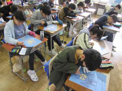 4年生は図画工作科で版画製作をしています。○○している自分の様子を、細かいところまで丁寧に、集中して彫っていました。