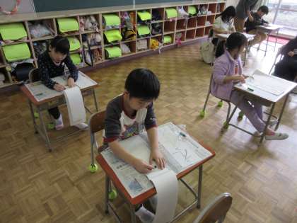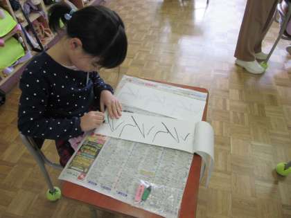 1年生は書き初め「えがお」の中の人文字、「え」の練習をしていました。1回書く毎に手本と見比べて、繰り返し練習していました。