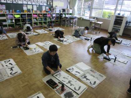3年生も書き初め練習をしていました。大きな紙に書くのは大変なので、半紙を使った練習でした。机で書いているいつもの習字と違い、床で書く練習でしたが、どの子も筆遣いに気を付けて真剣に取り組んでいました。