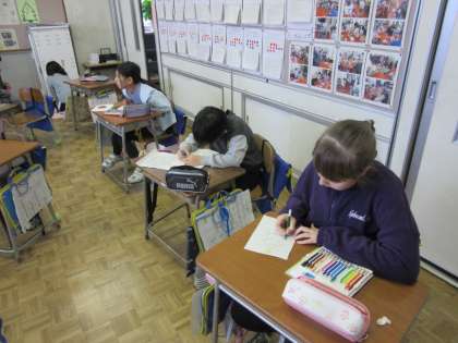 4年生は2学期末に行う集会の準備をしていました。プログラムを書く子、飾りをつくる子、終わりの言葉を考えている子、出し物のダンスの練習をしている子等それぞれが自分の役割を考えて活動していました。